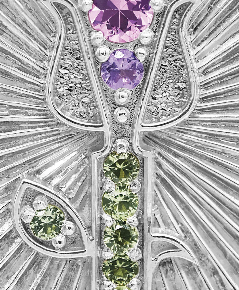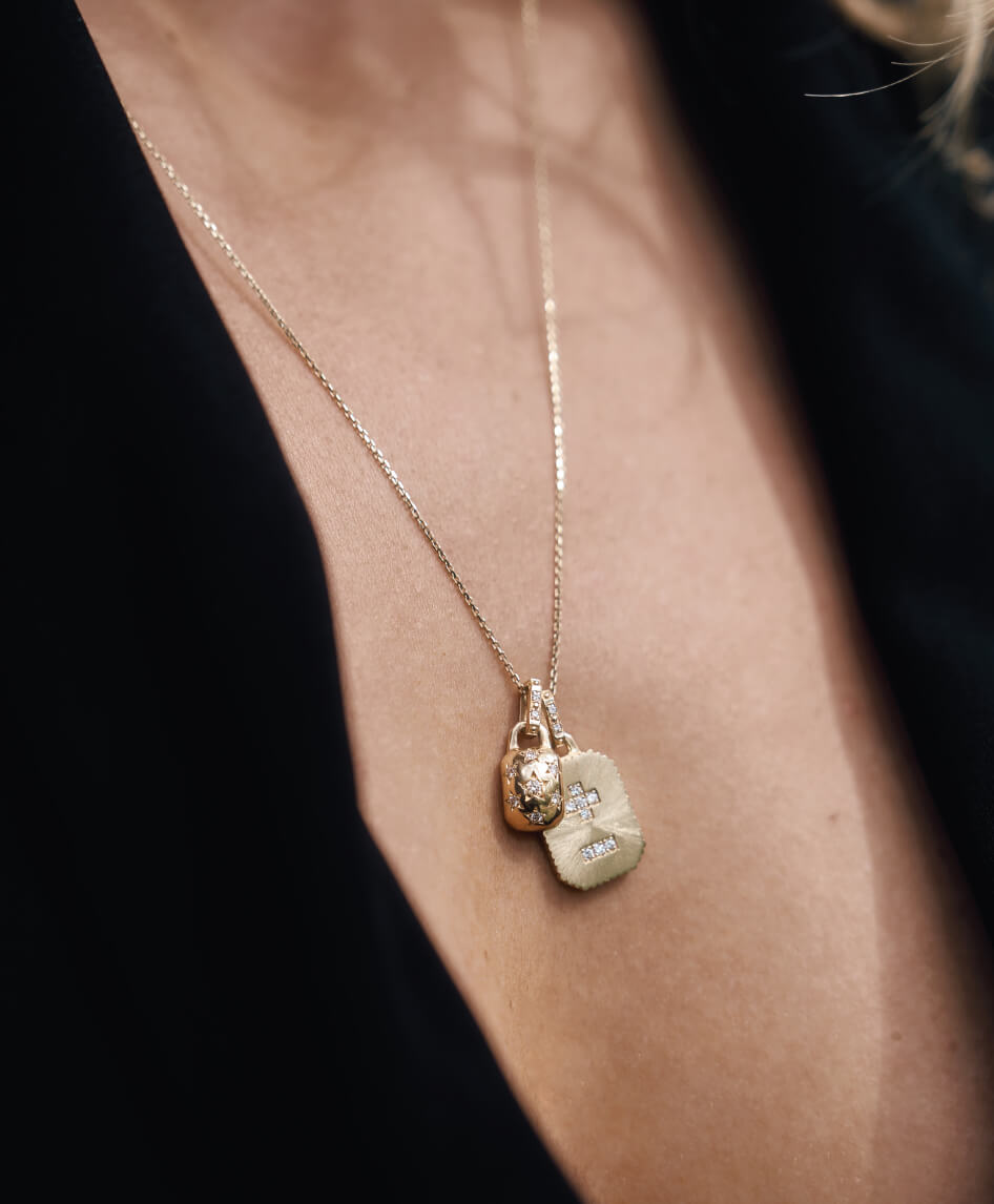 AMULETHA™ creations are designed as multi-layered sculptures. We use layers of metal to create depth and dimension, adding various textures to play with light. Diamonds, known for their purity, enhance the brilliance of each piece. Every amulet features a symbolic design, encapsulated in our signature AMULETHA shape, blending artistry with meaningful symbolism.