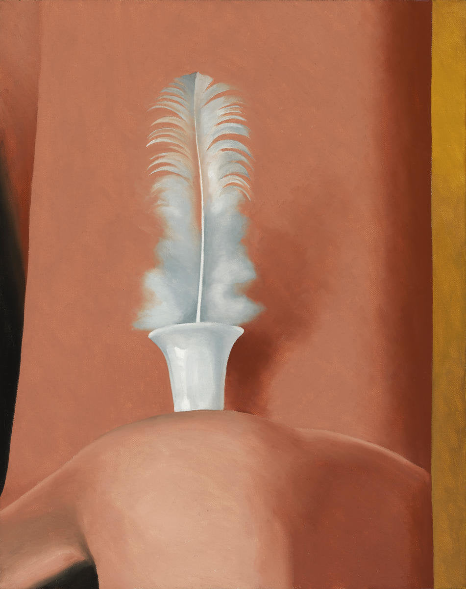 "White Feather" by Georgia O'Keeffe is a serene and minimalist painting that embodies her signature style of abstraction and close-up perspectives. O'Keeffe's approach in this piece, like many of her works, focuses on magnifying natural forms, drawing attention to their subtle textures, shapes, and the delicate interplay of light and shadow. The painting reflects her fascination with the simplicity and purity of organic objects, using soft, flowing lines and a restrained color palette to evoke a sense of quiet contemplation and harmony.
