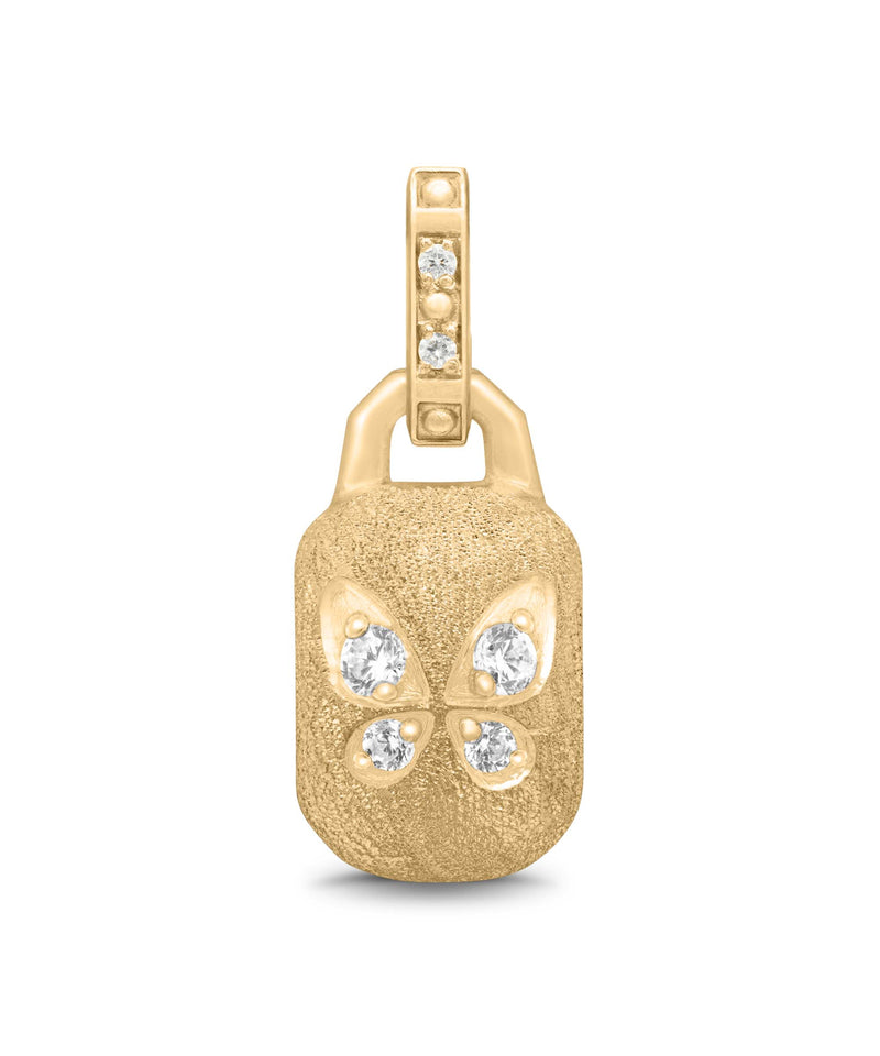 Handcrafted in Sterling Silver with an 18k Gold Vermeil Finish and adorned with brilliant White Topaz, this small-sized amulet features the elegant Butterfly motif. The butterfly tag amulet is a celebration of transformation, freedom, and beauty. It symbolizes the resilience to embrace change, the courage to break free from limitations, and the grace to navigate life’s ever-changing journey.