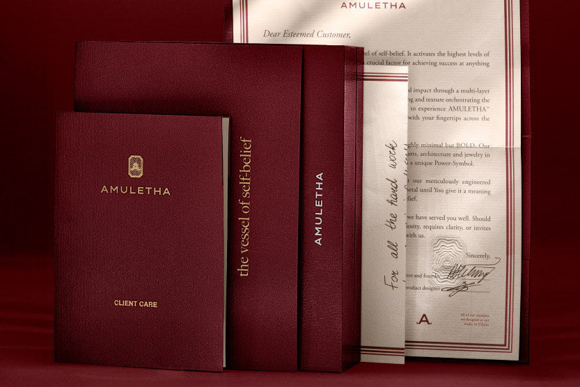 The Certificate of Authenticity is a vital document that guarantees your piece as a genuine AMULETHA™ creation. Each certificate is handwritten and stamped exclusively by our team, certifying the jewelry’s origin and authenticity.